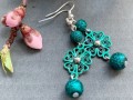 Dlouhé náušnice s petrolejovými voskovanými korálkami a stříbrnou dobarvenou kytičkou. Délka od háčku 4,5 cm, gumové zarážky.