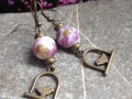 Náušnice ve starobylém stylu - vintage v barvě mosazi s bílou plastovou kuličkou s růžičkami a přívěskem ptáčka v klícce. Mosazný háček, gumové zarážky. Délka od háčku cca 3,5 cm