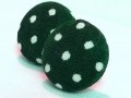 Náušnice (puzetky) tvořené technikou potahování knoflíků. Vytvořeny jsou z kovových komponentů a tmavězelenobílé bavlněné látky. Průměr náušnice je 1,5 cm. Součástí jsou plastové špuntíky proti vysmeknutí z ucha.