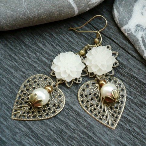 Delší romantické náušnice ve starobylém stylu - vintage v barvě mosazi s bílou resinovou kytičkou a perleťovou perličkou na mosazném lístku. Délka od háčku 5 cm, háček v barvě mosazi - běžný kov, gumové zarážky