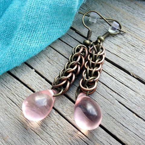 Náušnice z mosazných kroužků a skleněných růžovýck kapek - základ náušnic je ukroužkovám vazbou full persian. Délka od háčku 4 cm, háček a kroužky v barvě mosazi, běžný kov, gumové zarážky
