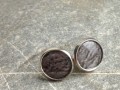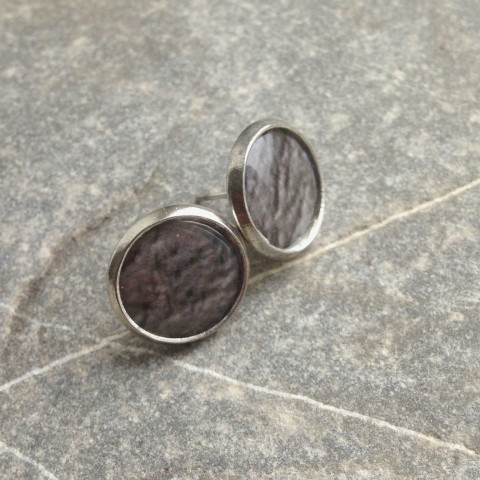 Drobné náušnice - stříbrné lůžko o průměru 1,2 cm, šedý střed zalitý křišt'álovou pryskyřicí, kovové zarážky
