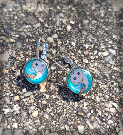 Kabošon s obrázkem sovy, vlepený do náušnicového lůžka z bižuterního kovu.
