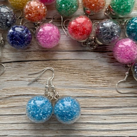 Náušnice - průhledné plastové koule vyplněné drobnými rokajlovými korálky a uzavřené víčkem. Kovové komponenty v barvě stříbra - běžný kov. Průměr koule cca 1,8 cm, délka od háčku 2,5 cm.