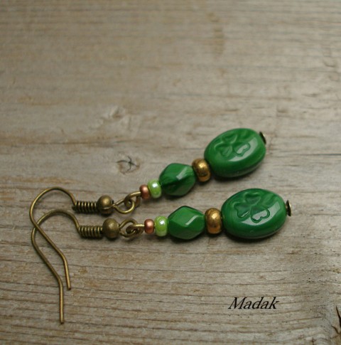 Náušničky ze skl. korálků s třílístky a rokajlu v zelené a mosazné barvě.