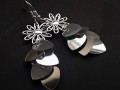 Dlouhé třpytivé náušnice se stříbrnými srdíčky a květinkou. Délka od háčku 6 cm. Díky použitému materiálu jsou velmi lehoučké.