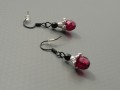 Náušnice jsou z vínově červeného broušeného skleněného korálku, středového ozdobného bižuterního komponentu stříbrné barvy a horního černého broušeného korálku.