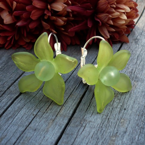 Náušnice se zelenou plastovou kytičkou a zeleným matným korálkem. Velikost kytičky 3 cm. Uzavíratelný háček v barvě stříbra, běžný kov. Kytička je k háčku přišita silonem a zakápnutá lepidlem.