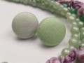 Náušnice (puzetky) tvořené technikou potahování knoflíků. Vytvořeny jsou z komponentů z nerezové oceli a světle zelené látky s fialovými detaily. Průměr náušnice je 19 mm. Součástí jsou kovové špuntíky proti vysmeknutí z ucha.