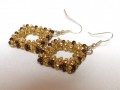 Náušnice jsou „ušité" z drobných zlatých a hnědých korálků. Čtverec z korálků má stranu cca 22 mm a je pověšený na stříbrném háčku. Náušnice jsou opatřený gumovými špuntíky, které brání vyklouznutí z ucha.