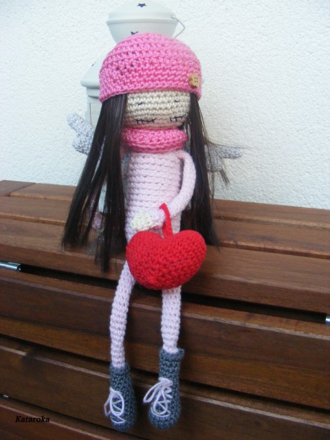 Háčkovaná andelka s umelými vláskami a srdiečkom, je veľká cca 25-30 cm. Farba vláskov sa može líšiť podľa dostupnosti. Farebná kombinácia bola vyrobená na želanie, je možné zmeniť a navrhnúť si vlastnú.
