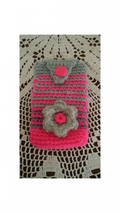 Háčkovaná kapsička na drobnosti, nebo obal na mobil, z růžové a šedé akrylové příze se zapínáním na knoflík, ozdobená našitou kytičkou.
