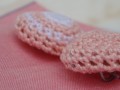 Sada čtyř hravých knoflíčků obháčkovaných bavlněnou přízí v jemných bílo-růžovo-fialových tónech.