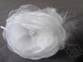 Čelenka univerzální velikosti, kovový základ potažený atlasovou stužkou, zdobená květem z organzy (průměr cca 10 cm), perličkami a peříčky, květ začištěn filcem - vše v odstínu BÍLÁ.