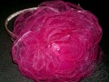 Čelenka univerzální velikosti, kovový základ potažený satenovou stužkou v starorůžové barvě. Květ z malinově růžové organzy (průměr květu cca 10 cm, výška cca 4 cm), zdobený korálky, začištěný filcem.