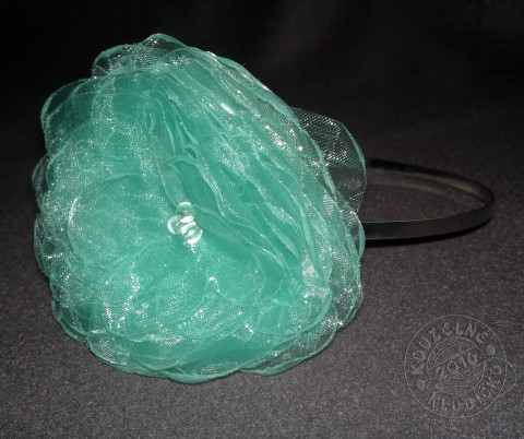 Čelenka univerzální velikosti, kovový stříbrný základ, květ z mentolově zelené organzy (průměr květu cca 9-10, výška cca 4 cm), zdobený korálky, začištěný filcem.