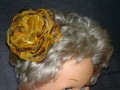 Čelenka univerzální velikosti, kovový základ stříbrné barvy, konce podlepepy měkkým filcem. Bohatý květ poskládaný z čokoládově hnědé, oranžové a žluté organzy (průměr květu cca 10 cm, výška cca 4 cm), zdobený perličkou, začištěný filcem.