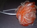 Čelenka univerzální velikosti, kovový základ potažený atlasovou stužkou světle šedé barvy. Bohatý květ poskládaný z pastelové a pomerančové oranžové organzy (průměr květu cca 10 cm, výška cca 4 cm), zdobený korálky, začištěný filcem.