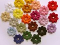 22 barevných odstínů jsem použila při háčkování těchto jemných plastických kytiček. Materiál je slaboučká bavlněná příze 30cítka. Kytičky mají po obvodu 8 okvětních lístků ve 4 řadách. Uprostřed každé kytičky je všita větší perla. Na rubu je skryté poutko na případné protažení stužky.