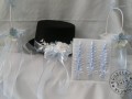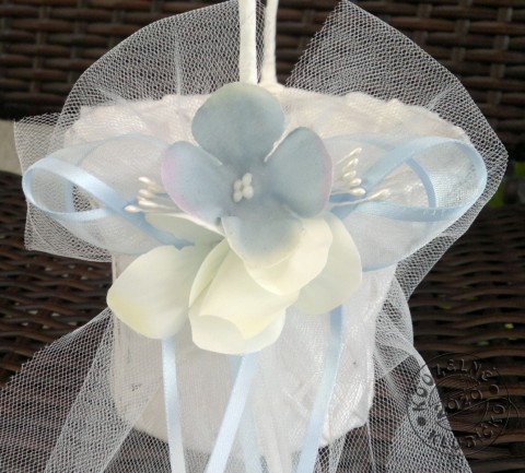 Košík je přizdoben tylem, monofilovou a saténovou stužkou, pestíky a kvítky hortenzie - zdobeno v odstínech světle modré a bílé.