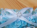 Jemný krajkový podvazek zdobený saténovou stužkou, mašličkou ze stužek a plastovým věnečkem složeným z droboučkých perliček. Krajka v barvě pomněnkově modrá (světle tyrkysová), stužka bílá.