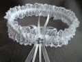Jemný krajkový podvazek zdobený saténovou stužkou v bílé barvě, mašličkou ze stužek, kytičkou a rokajlem. BARVA kytičky - světle modrá nebo tyrkysově modrá - VYBERTE SI a napište mi do oznámky u objednávky.