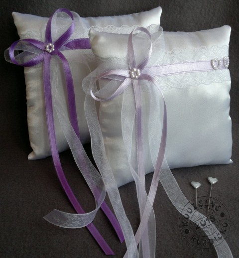 Satenový polštářek pod snubní prstýnky v bílé barvě, zdobený něžnou bílou krajkou, bílou šifonovou, atlasovou stužkou, výběr ze 2 odstínů: ledově fialová (světlá) a středně fialová (tmavší) a srdíčky, plněný dutým vláknem. Rozměry cca 15x15 cm. VYBERTE SI ODSTÍN STUHY A NAPIŠTE MI DO POZNÁMKY!