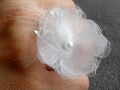 Základem je polotovar - prstýnek s lůžkem který je přizdoben organzovým kvítkem (průměr cca 4 cm), perličkou, peříčkem, pestíky a satenovou stužkou.