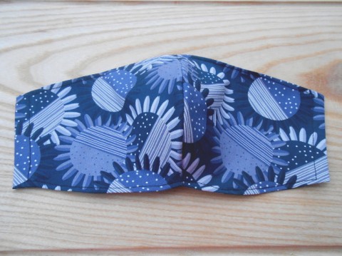 Dvouvrstvá rouška o šířce cca 24 cm a výšce cca 14 cm z látky modré složené ze 100% bavlny a s navlečenou kulatou gumičkou za uši jejíž délku si sami upravíte a lze ji vyměnit, protože je navlečena v tunýlku. Kulatá gumička dle aktuální nabídky.
