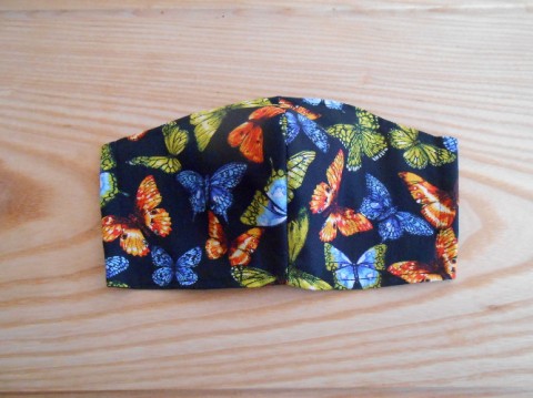 Dvouvrstvá rouška o šířce cca 24 cm a výšce cca 14 cm s motýlky z 100% bavlněné látky, vnitřní vrstva (obličejová) z 100% jednobarevné bavlněné látky. S navlečenou kulatou gumičkou za uši jejíž délku si sami upravíte a lze ji vyměnit, protože je navlečena v tunýlku. Kulatá gumička dle aktuální nabídky.