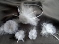 Brož/spona ve tvaru květu z bílé organzy (průměr cca 7 cm), který je přizdoben perličkami, peříčky a tylem, začištěn filcem.