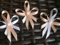 Svatební vývazek ze 2 satenových stužek (6mm) - meruňková - na společné fotce v první, horní řadě, zdobený perličkou 4 mm, doplněný nerez špendlíkem s kapičkou.