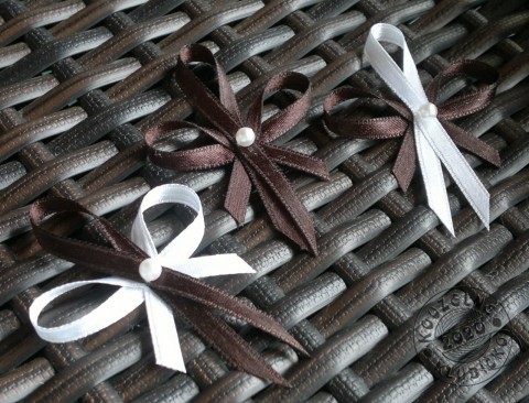 Svatební vývazek ze 2 satenových stužek (6mm) - tmavě hnědá - na společné fotce v prostřední řadě, zdobený perličkou 4 mm, doplněný nerez špendlíkem s kapičkou.