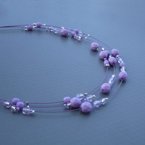 Náhrdelník je tvořený z tří řad bižuterního lanka fialové barvy, na kterém jsou navlečeny v nepravidelných odstupech od sebe různě velké světle fialové skleněné broušené korálky.
