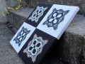 Obraz, koláž ručně paličkovaných krajek do geometrické kompozice v klasické kontrastní barevnosti. Tradiční krajkářské řemeslo v novém moderním pojetí. Jedinečný solitér do vašeho moderního interiéru.