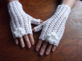 Návleky na ruce s krajkovým vzorem jsou uháčkovány z české, příjemné a lehké akrylové bílé příze. Celková délka 20 cm. Ozdobeny jsou kytičkami - brožemi s perličkou a zapínáním na brožový můstek. Kytičky se dají podle nálady odepnout, nebo připnout na jinou část oděvu, na tašku, svetr, čepici a pod.