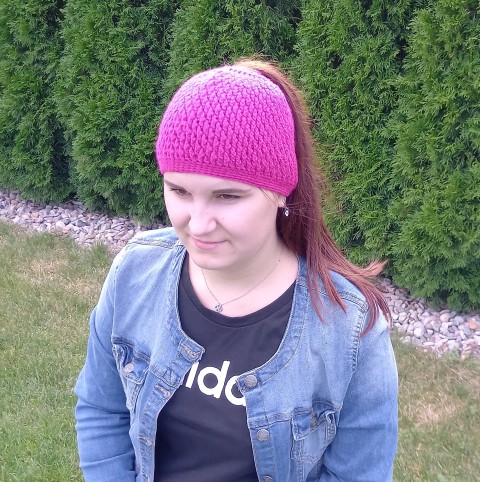 Je uháčkovaná s otvorem pro dlouhé vlasy. Lze provléct cop, drdol.