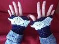 Delší návleky na ruce jsou uháčkovány krajkovým vzorem z tmavě modré a světle modré, příjemné a lehoučké akrylové české příze.