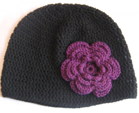 Háčkovaná černá čepka s fialovou aplikací.Obvod 54 cm, výška 20 cm. Na přání uháčkuji jinou velikost i barvu.