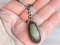 Přívěsek na klíče je zhotoven z tromlovaného kamínku a kovových kompenentů technikou tiffany (cínování, měkké pájení). Celá klíčenka je dlouhá 7,6cm. Přívěsek je patinován a ošetřen antioxidantem.