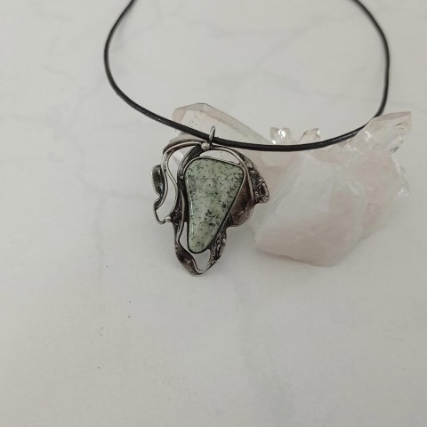 Autorský šperk zhotoven z bezolovnatého cínu se stříbrem, grossularitu a drátu.