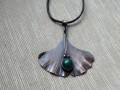Měděný přívěsek jinanu dvoulaločného , uvnitř je vložen zelený malachitek, ,průměr 10 mm, . Výška přívěsku je 6 cm, šíře 6 cm.