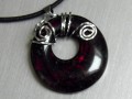 Přívěsek s rubínovým skleněným donutem, který jsem vytvořila spékáním v elektrické peci. Je velký 3 x 3 cm a je upevněný v opletu z nerezového drátku. Je zavěšený na tenkém koženém řemínku, dlouhém 46 cm - lze upravit.