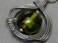 Přívěsek s výraznou dichroickou vinutkou ze zeleného skla od firmy Panduro, vyrobený náročnou technikou wire-wrapping z drátu z nerezové oceli. Přívěsek je velký 3,5 x 3 cm.