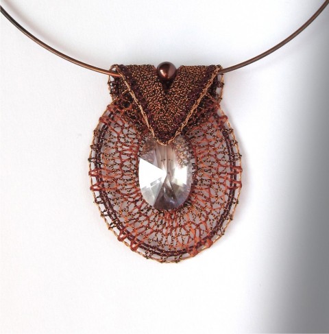 Moderní přívěs z ručně paličkované krajky oválného tvaru. Barva- měděná. Uprostřed krajky je broušený křišťál mandlového tvaru. Šperk je zavěšen na kovovém kruhu-staroměď.