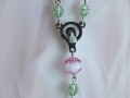 Ketlovaný růženec z mačkaných skleněných korálků zelené barvy, růžových skleněných korálků a kovových komponentů má po obvodu délku 68cm. Přívěsek je dlouhý 9cm včetně křížku.