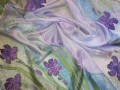 Hedvábný šátek rozměr 90x90 cm v odstínech fialová, šedá, šedomodrá, zelená a jejich vzájemné kombinace se stříbrnou linkou. Návod na údržbu přiložen.