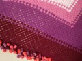 Háčkovaný šátek v odstínech růžová, starorůžová, cyklamen a burgun s ozdobným volánkem z bambulkové příze, je vyroben z české, příjemné a lehoučké akrylové příze. Váha pouhých 220 gramů.
