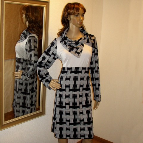 ORIGINÁLNÍ MÓDNÍ ÚPLETOVÉ ŠATY. KOLEM VÝSTŘIHU VĚTŠÍ ROLÁKOVÝ LÍMEC. NA PŘEDNÍM I ZADNÍM DÍLE ZÁŠEVKY. ŠATY TAK LÉPE SEDÍ. DLOUHÝ RUKÁV. PŘÍJEMNÝ ÚPLET.