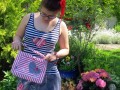 K šatům je ušita červenobílá kabelka na nezbytnosti s kapsou a aplikací srdíček.